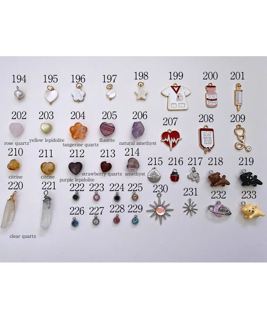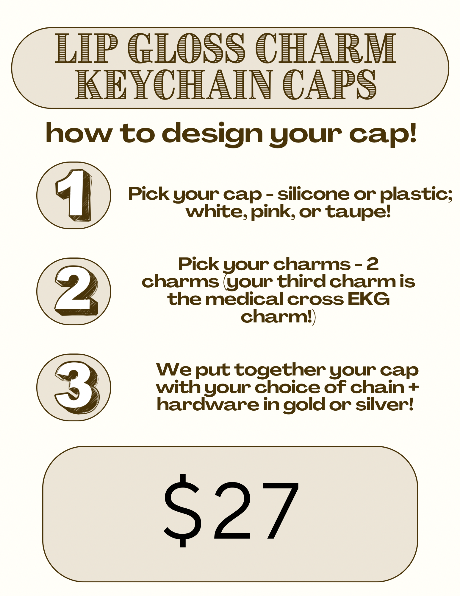 3) in the notes section of your order, name your cap choice and 2 charm choices (one of your charms is the beautiful medical cross /EKG charm). Please specify what colour cap you’d like: silicone comes in white and taupe, plastic comes in white, black, pink, and mauve.